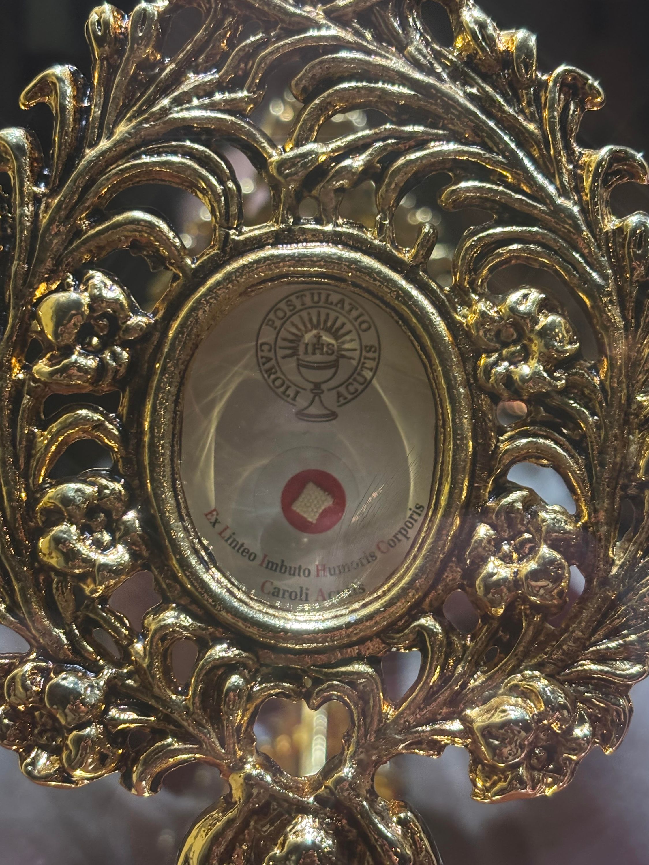 Holy Cross Tralee is honoured to hold two first-class relics of Saint Carlo Acutis. In November 2024 Monsignor Anthony Figueiredo, who serves in the Diocese of Assisi, visited Holy Cross with a first-class heart relic of then Blessed Carlo. In acknowledgement of the depth of the response locally during his visit, Monsignor Anthony, as custodian of the heart relic, gifted a first-class ex capillis relic to Holy Cross Tralee. In the weeks that followed, Carlo's mother Antonia came to know of the warmth with which her son's relic was received in Holy Cross, thus prompting her to gift another first-class relic to Holy Cross in the spring of 2025. This relic, ex linteo imbuto humoris corporis Caroli Acutis, is a piece of cloth which was used by Antonia to wipe Carlo's brow in the final stages of his illness.