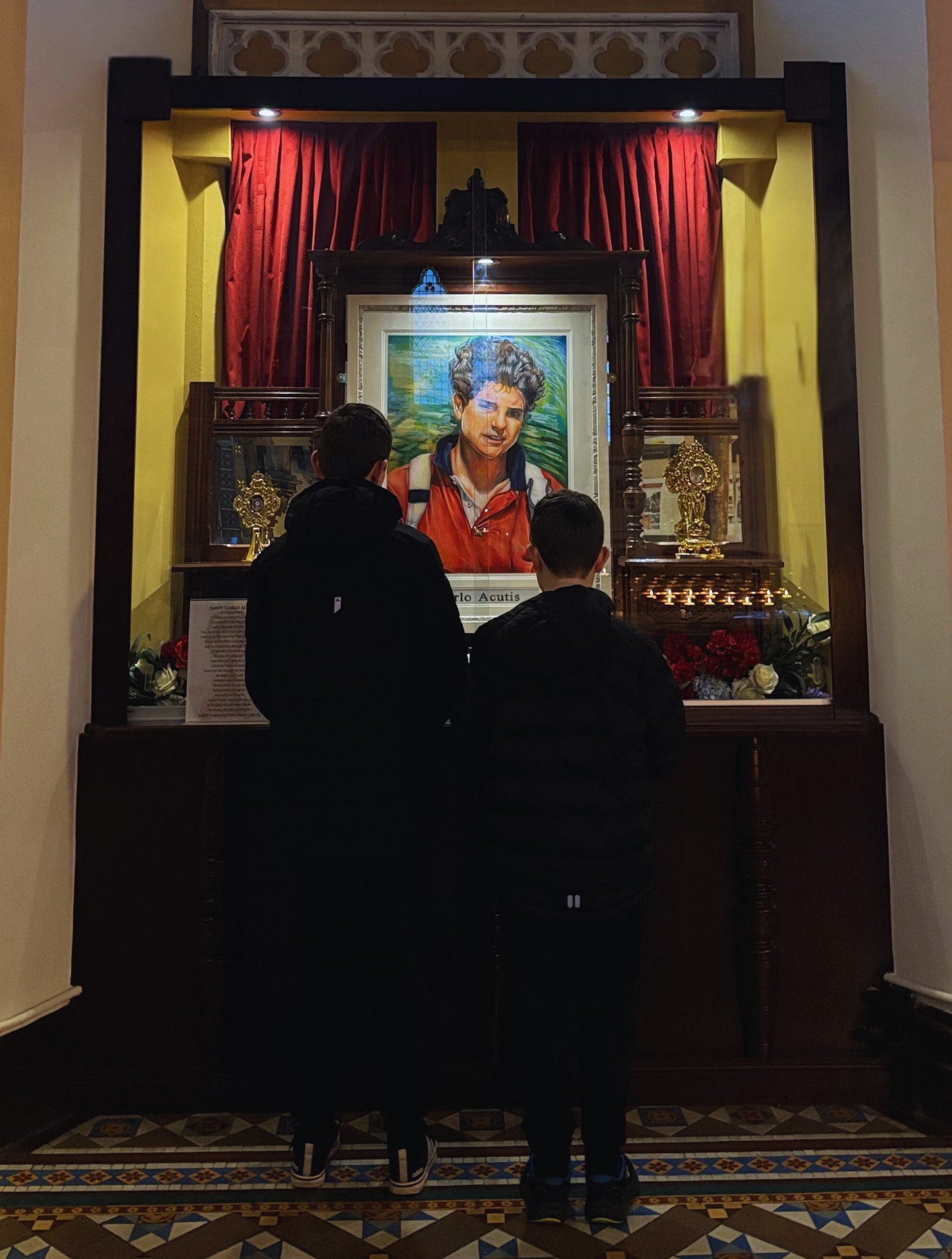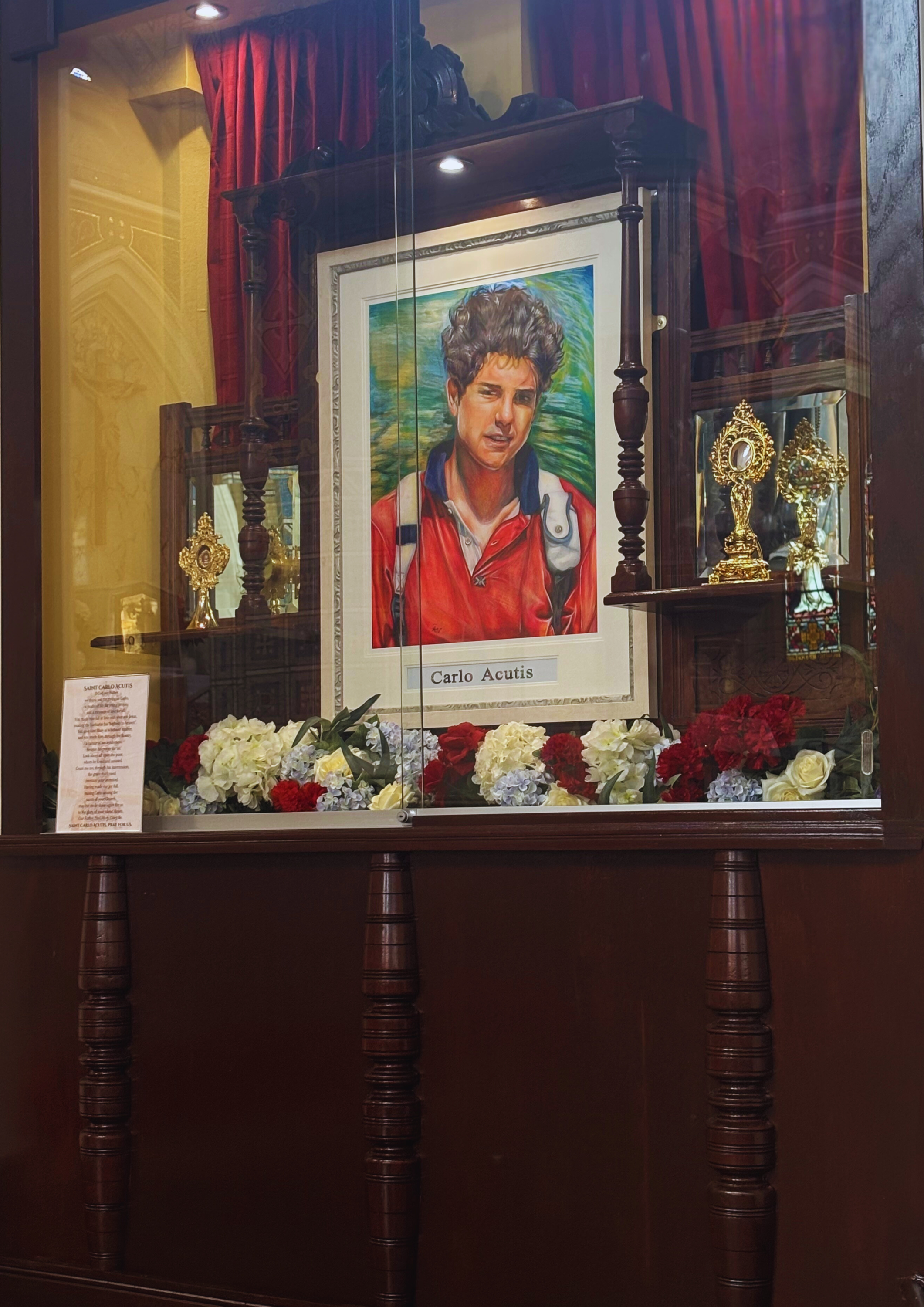 A beautifully crafted shrine dedicated to Saint Carlo is in place in Holy Cross and fittingly, given Carlo's dedication to the Virgin Mary as his beloved Mother, the shrine is located beside the altar to Our Lady of Fatima. The two first-class relics sit either side of a striking depiction of Carlo, painted by student Áine Newsome of Mercy Mounthawk Secondary School, Tralee and gifted to Holy Cross in celebration of the arrival of the relic in November 2024. The shrine wonderfully blends old mahogany from disused furniture, an acknowledgement of Pope Francis' call for the protection and care of earth's resources.