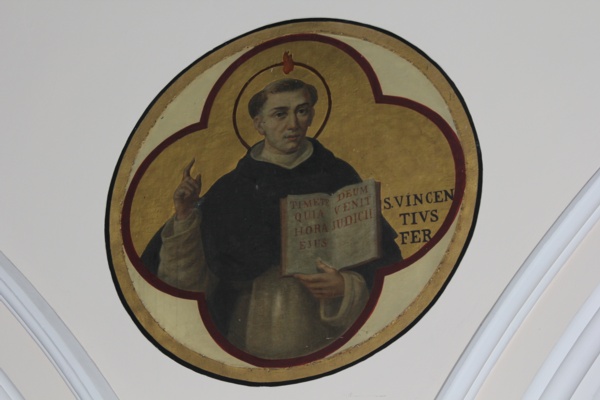 Having made a particular study of Scripture and Hebrew, Vincent was well equipped to preach to the Jews. They were quite numerous in Spain at the time. During the years of his preaching, more than 30,000 Jews and Moors were converted to Christianity. His numerous miracles, the strength and beauty of his voice, the purity and clarity of his doctrine, combined to make his preaching effective, Based as it was on a firm foundation of prayer. Vincent worked so intensely that he fell mortally ill and only a miraculous visit from Sts Francis and Dominic cured him. On this occasion, he was bidden to rise and preach whenever and wherever he was needed. The preaching of Vincent became a strange but marvellously effective process. He attracted to himself hundreds of people - at one time more than 10,000 - who followed him from place to place in the garb of pilgrims.